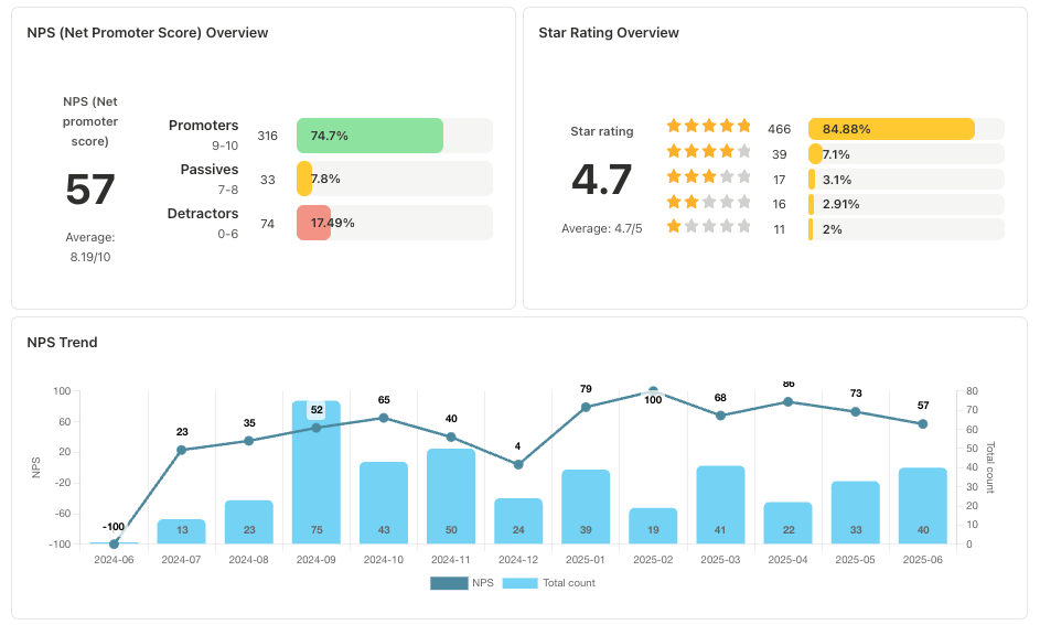 All feedback can be automatically imported into the company's internal communication channel, and intelligent customer satisfaction reports make it easy to track the big picture when it comes to customer insights.