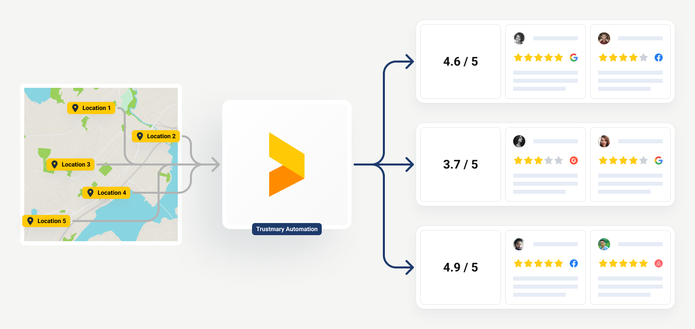 Show reviews specific to each branch or region. Connect multiple Google Maps locations and other review platforms.