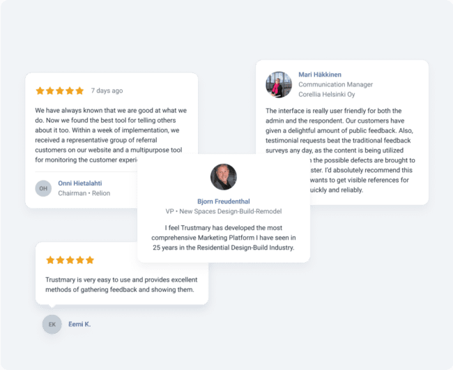 Trustmary es una opción flexible para recopilar testimonios. No pagas por cosas abstractas: pagas por la cantidad de testimonios que quieras conseguir. Tenemos un equipo bien preparado que te ayudará por chat y por email. Trustmary es una empresa pequeña y ágil que reacciona a los comentarios de los clientes y mejora el producto constantemente. Lo más importante es que Trustmary no te consigue cualquier testimonio: ¡nos aseguramos de que consigas reseñas realmente significativas de las que puedas sacar provecho!