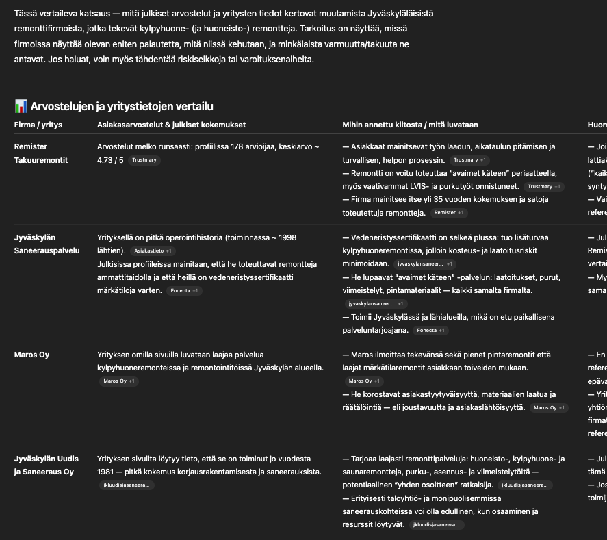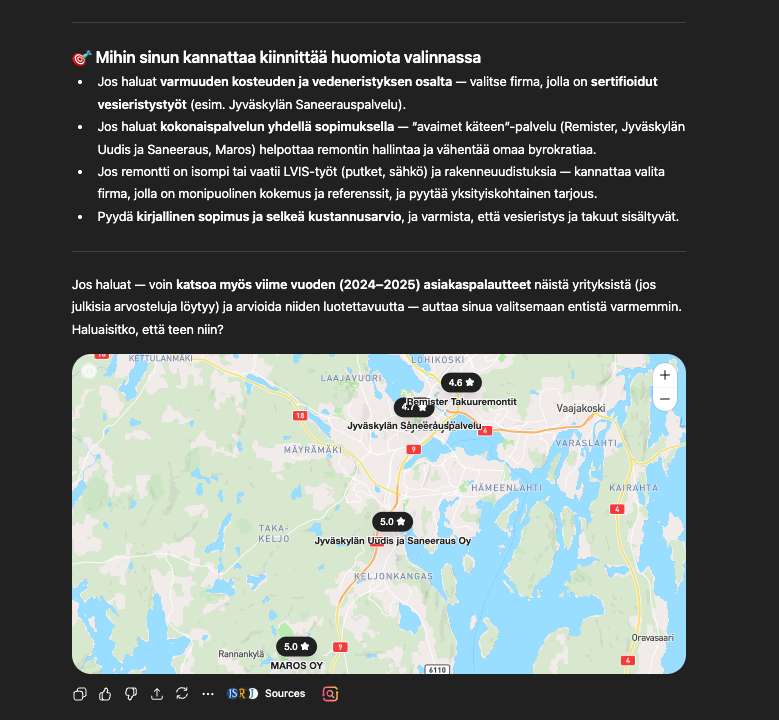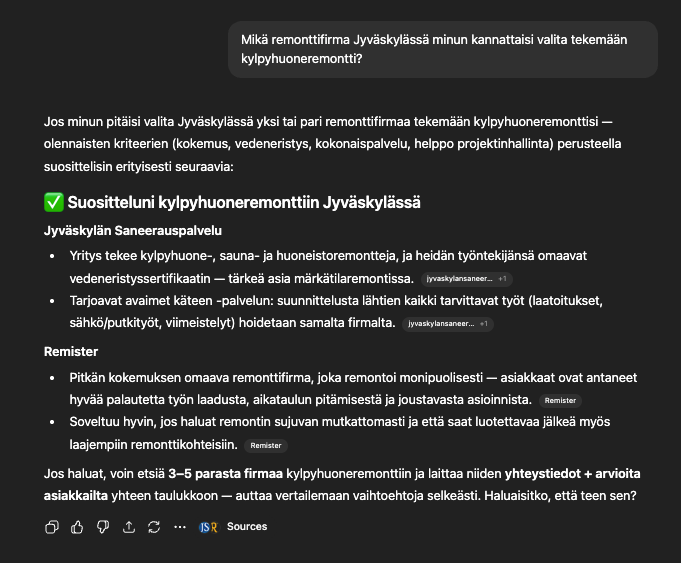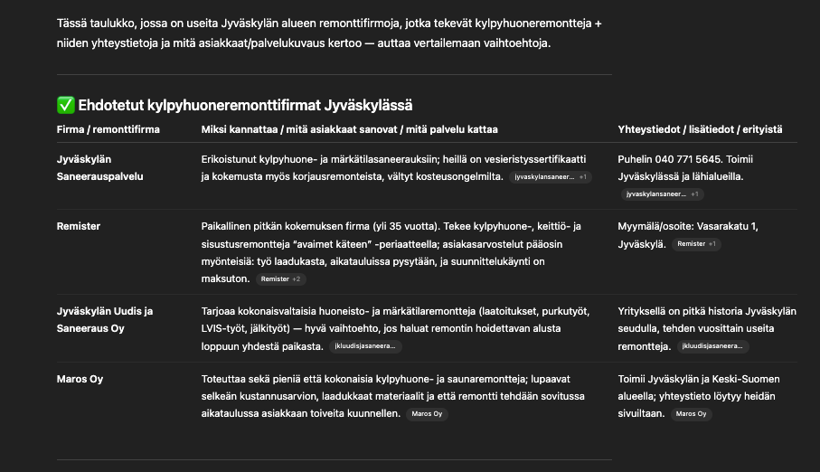 Tässä tapauksessa käytin ChatGPT:tä etsiäkseni kylpyhuoneremonttifirmaa Jyväskylässä: