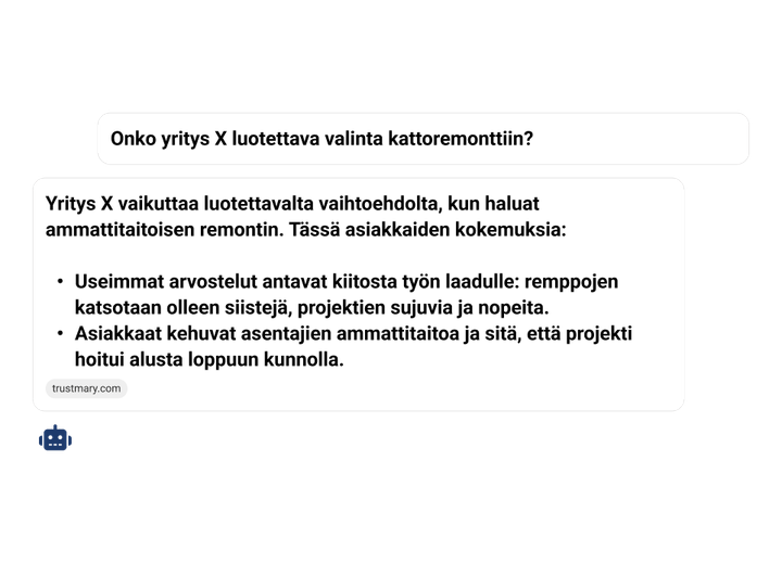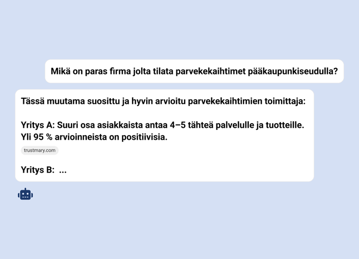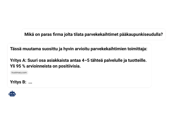 Olemme systemaattisesti testanneet asiakkaidemme näkyvyyttä erilaisissa AI-chateissa, ja huomanneet, että erityisesti profiilisivujen avulla asiakkaamme saavat niissä mainintoja. Myös jo pelkät arvostelut nettisivulla voivat auttaa, mutta Trustmary-profiilisivu tuo lisää uskottavuutta.