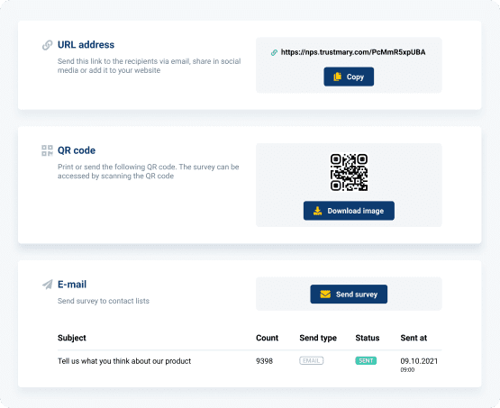 Trustmary tarjoaa monia tapoja jakaa Net Promoter Score -lomakkeita aina sähköpostiautomaatioista QR-koodeihin.
