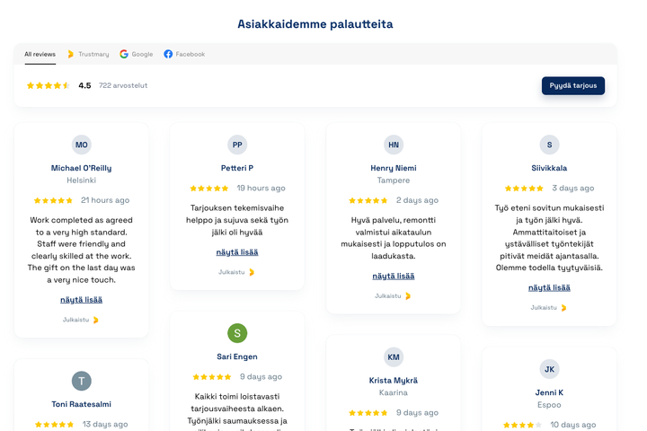 - Tyytyväisten asiakkaiden arvosteluja kannattaa lisätä verkkosivulle: etusivulle, palvelu- tai toimipistekohtaisille alasivuille, sekä “kokemuksia” -alasivuille.