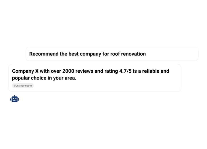 L’utilisation de Trustmary est le moyen le plus simple d’optimiser votre présence pour la recherche IA, car elle augmente la probabilité que les opinions de vos clients soient mentionnées et recommandées dans les réponses générées par l’intelligence artificielle.