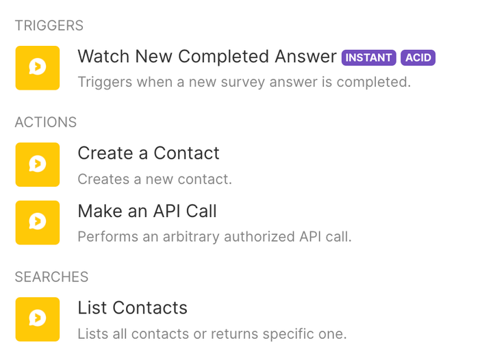 New Survey Answer and Survey Answer Completed as triggers. Create or Update Contact, Delete Contact, Trigger Automation for Contact, and Send Survey Invite as actions.
