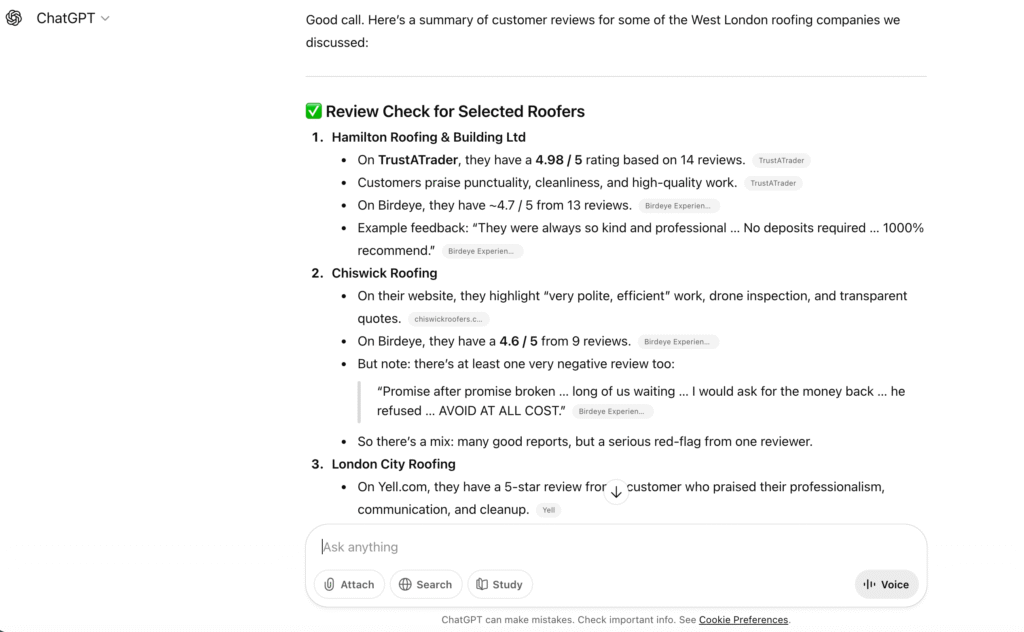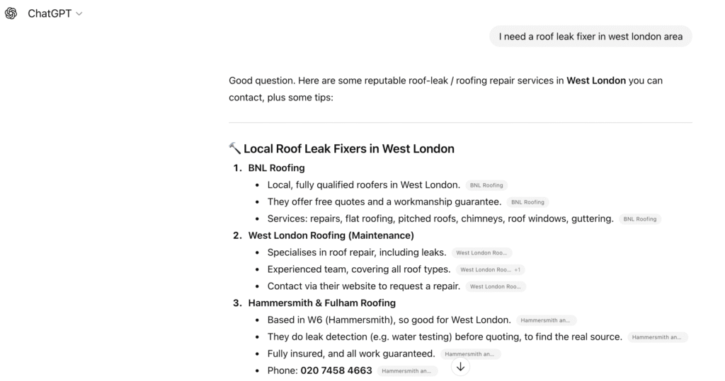 In this case, I used ChatGPT to look for roof leak fixes in the West London area.