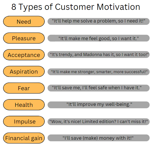 Speaking to customer pain points, needs, and wants, you attract conversions. As a rule, marketers appeal to eight motivation types driving consumers to action: