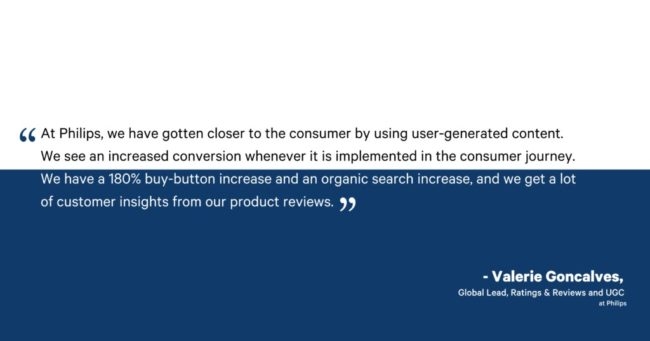 “På Philips har vi kommit närmare konsumenterna genom att använda användargenererat innehåll. Vi ser en ökad konvertering när den implementeras i konsumentresan. Vi har en 180-procentig ökning av klick på köpknappen och en ökning av organiska sökningar, och vi får en hel del kundinsikter från våra produktrecensioner.”