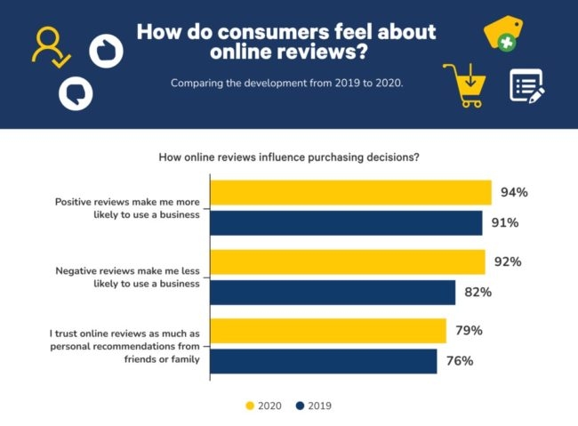 - År 2020 var 94 % av konsumenterna mer benägna att lita på ett företag efter att ha sett en positiv recension på nätet. Det är en ökning med 3 % jämfört med föregående år.