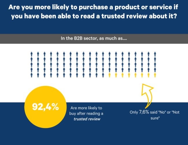 Om du tror att recensioner online bara är viktiga för onlinebutiker och B2C-företag i allmänhet har du fel. 92,4 % av B2B-kunderna är mer benägna att köpa en produkt eller tjänst när de har läst en recension om den.