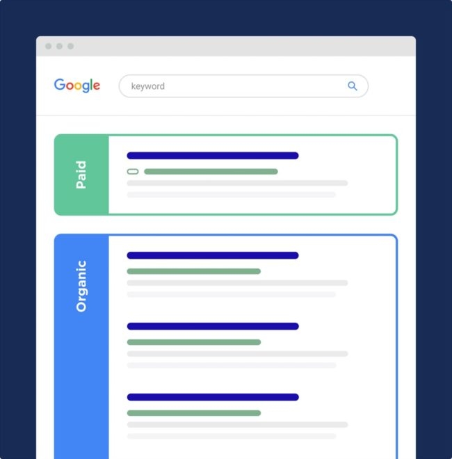 SERP avgör hur din webbplats visas på Googles första sida. Det finns två huvudkategorier: betalda och organiska resultat. Folk hoppar ofta över de betalda, så fokusera på att hamna högst upp på listan över organiska resultat.